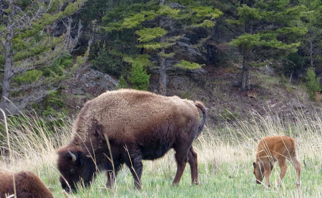 For us, a perfect day is around 60 but anything under 50 is a deal breaker. The first day was beautiful and we got to take lots of bison pictures including one of a calf. I just went gaga over these big beasts. They have a big body on their wooly head and I can see why so many tourist get gored each year - because the temptation to pet them runs high. These creatures are huge - don't try to pet them. There was a small car in front of us at one point and a bison seemed to take exception to the persons car - we thought there was going to be an incident as the look on the bisons face was not kind but the bison went on after staring the car down.